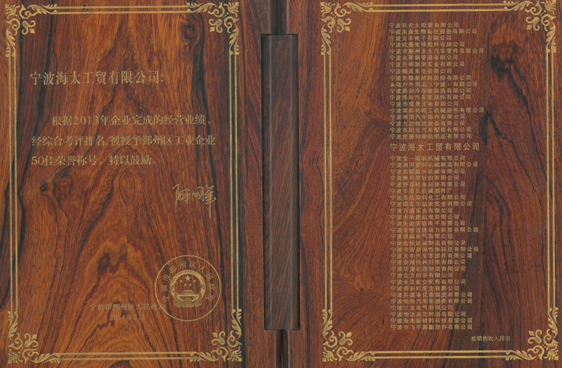 熱烈祝賀浙江天星集團(tuán)工業(yè)板龍頭企業(yè)海太工貿(mào)獲得2014年度鄞州區(qū)“雙五十工程”“五十佳”稱號(hào)。本次評(píng)比根據(jù)企業(yè)2013年度經(jīng)營業(yè)績,有相關(guān)職能部門核準(zhǔn),鄞州區(qū)人民政府審議通過,授予榮譽(yù)。